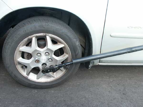 We start off by loosening the wheels lug nuts. This can be pretty hard to do if the wheel was previously tightened by air gun at your local mechanic’s shop or simply if it has not been touched in a long time. That’s why we had to use this metal pipe extension to give me more leverage. We loosen the lug nuts a bit (about 1/4 of rotation) before the car is jacked up and we’ll do the rest once the car has been raised. (picture 1)